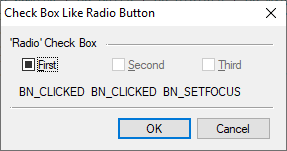 As shown, BS_3STATE is the style that will make the “First” button behave in a tri-state as unchecked, checked and undefined: