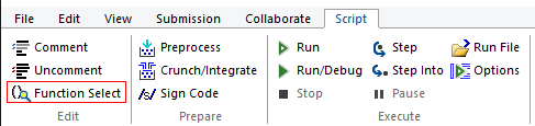 A function has been added to “crunch” code. This IDE function is also available as a script function within the IDE. The function is available from the ribbon as Script | Prepare | Crunch Integrate. The dialog appears as follows: