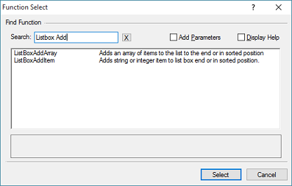 Clicking on a function in the results will display the short information in the lower box (as shown in the previous figure). If the Display Help box is checked, the help system is opened (if not already open) and the currently selected function’s documentation is displayed. This makes it easy to quickly review the details of functions.